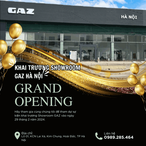 Với chiến lược phát triển bền vững và lâu dài hệ thống bán hàng – chăm sóc dịch vụ xe Gaz tại thị trường Việt Nam. Gaz Việt Nam tập trung phát triển mạnh các điểm bán hàng và chăm sóc dịch vụ tại các thị trường trọng điểm. Ngày 29 tháng 02 năm 2024, Gaz Việt Nam long trọng tổ chức lễ khai trương Showroom Gaz Hà Nội tại Lô 01, KCN Lai Xá, Xã Kim Chung, Huyện Hoài Đức, TP Hà Nội.